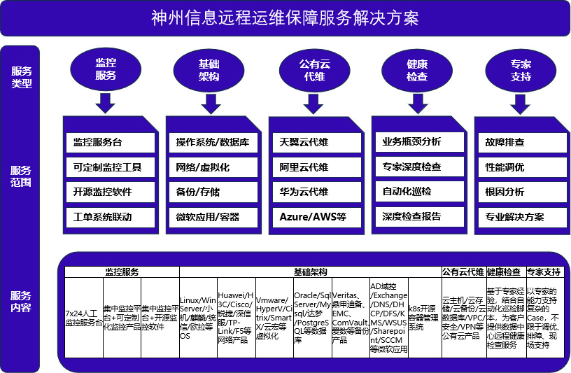 依托7×24小时智能监控中心、专业化运维管理平台及资深级技术专家团队,构建三位一体的远程运维服务体系,提供包括对公有云、私有云、机房、网络、服务器、操作系统、存储、备份、数据库、中间件、应用、安全等ICT基础设施的远程保障服务。为客户数字化转型、人工智能、云计算、物联网、区块链、数字资产等前沿技术领域保驾护航,驱动客户数字创新进程。