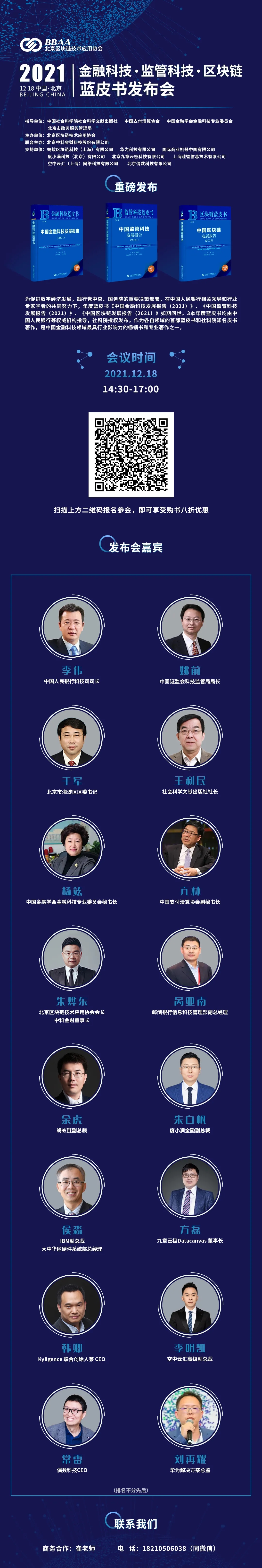 由中国社会科学院社会科学文献出版社、中国支付清算协会、中国金融学会金融科技专业委员会、北京市政务服务管理局指导,北京区块链技术应用协会主办,北京中科金财有限公司联合主办的2021年金融科技、监管科技、区块链蓝皮书发布会(第五届)将于2021年12月18日下午14:30采取线上直播方式举办。届时,来自监管机构、行业协会、科研院所、金融科技企业、金融机构等众多嘉宾汇聚一堂,重磅发布由央行货币政策司孙国峰司长、科技司李伟司长,证监会科技监管局姚前局长主编的监管科技、金融科技、区块链三本蓝皮书。同时,会议上,将围绕“科技创新助力中国数字经济发展”主题展开深入交流探讨。欢迎各界行业大咖及朋友们线上指导交流!