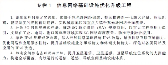 (一)加快建设信息网络基础设施。建设高速泛在、天地一体、云网融合、智能敏捷、绿色低碳、安全可控的智能化综合性数字信息基础设施。有序推进骨干网扩容,协同推进千兆光纤网络和5G网络基础设施建设,推动5G商用部署和规模应用,前瞻布局第六代移动通信(6G)网络技术储备,加大6G技术研发支持力度,积极参与推动6G国际标准化工作。积极稳妥推进空间信息基础设施演进升级,加快布局卫星通信网络等,推动卫星互联网建设。提高物联网在工业制造、农业生产、公共服务、应急管理等领域的覆盖水平,增强固移融合、宽窄结合的物联接入能力。