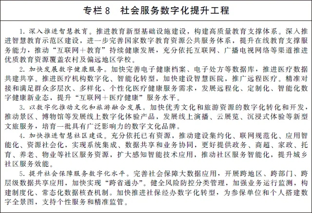 (二)提升社会服务数字化普惠水平。加快推动文化教育、医疗健康、会展旅游、体育健身等领域公共服务资源数字化供给和网络化服务,促进优质资源共享复用。充分运用新型数字技术,强化就业、养老、儿童福利、托育、家政等民生领域供需对接,进一步优化资源配置。发展智慧广电网络,加快推进全国有线电视网络整合和升级改造。深入开展电信普遍服务试点,提升农村及偏远地区网络覆盖水平。加强面向革命老区、民族地区、边疆地区、脱贫地区的远程服务,拓展教育、医疗、社保、对口帮扶等服务内容,助力基本公共服务均等化。加强信息无障碍建设,提升面向特殊群体的数字化社会服务能力。促进社会服务和数字平台深度融合,探索多领域跨界合作,推动医养结合、文教结合、体医结合、文旅融合。