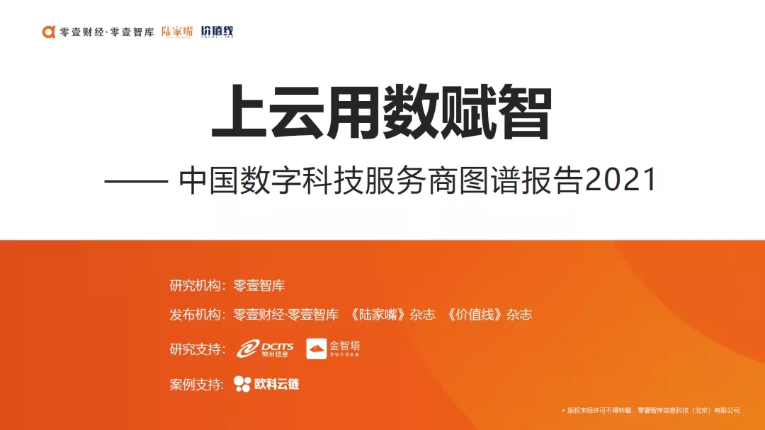 会上,《上云用数赋智:中国数字科技服务商图谱报告2021》由零壹财经·零壹智库、《陆家嘴》杂志和《价值线》联合发布。神州信息、金智塔提供研究支持,欧科云链提供案例支持。