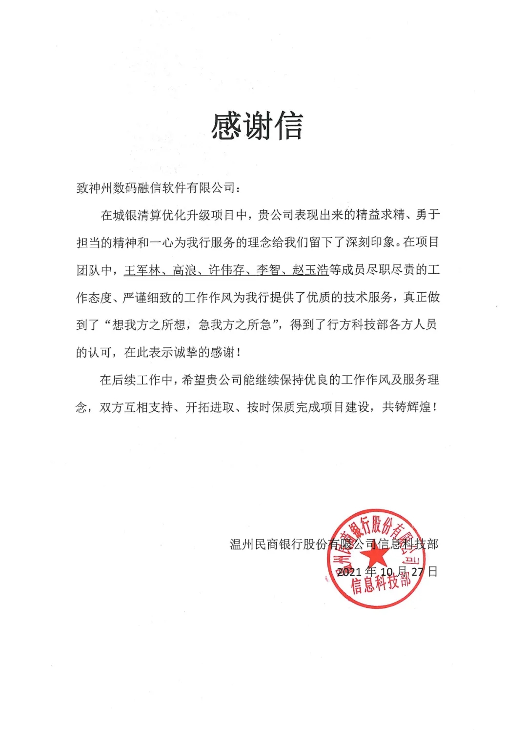 在城银清算优化升级项目中,贵公司表现出来的精益求精、勇于担当的精神和一心为我行服务的理念给我们留下了深刻印象。在后续工作中,希望贵公司能继续保持优良的工作作风及服务理念,双方互相支持、开拓进取、按时保质完成项目建设,共铸辉煌!