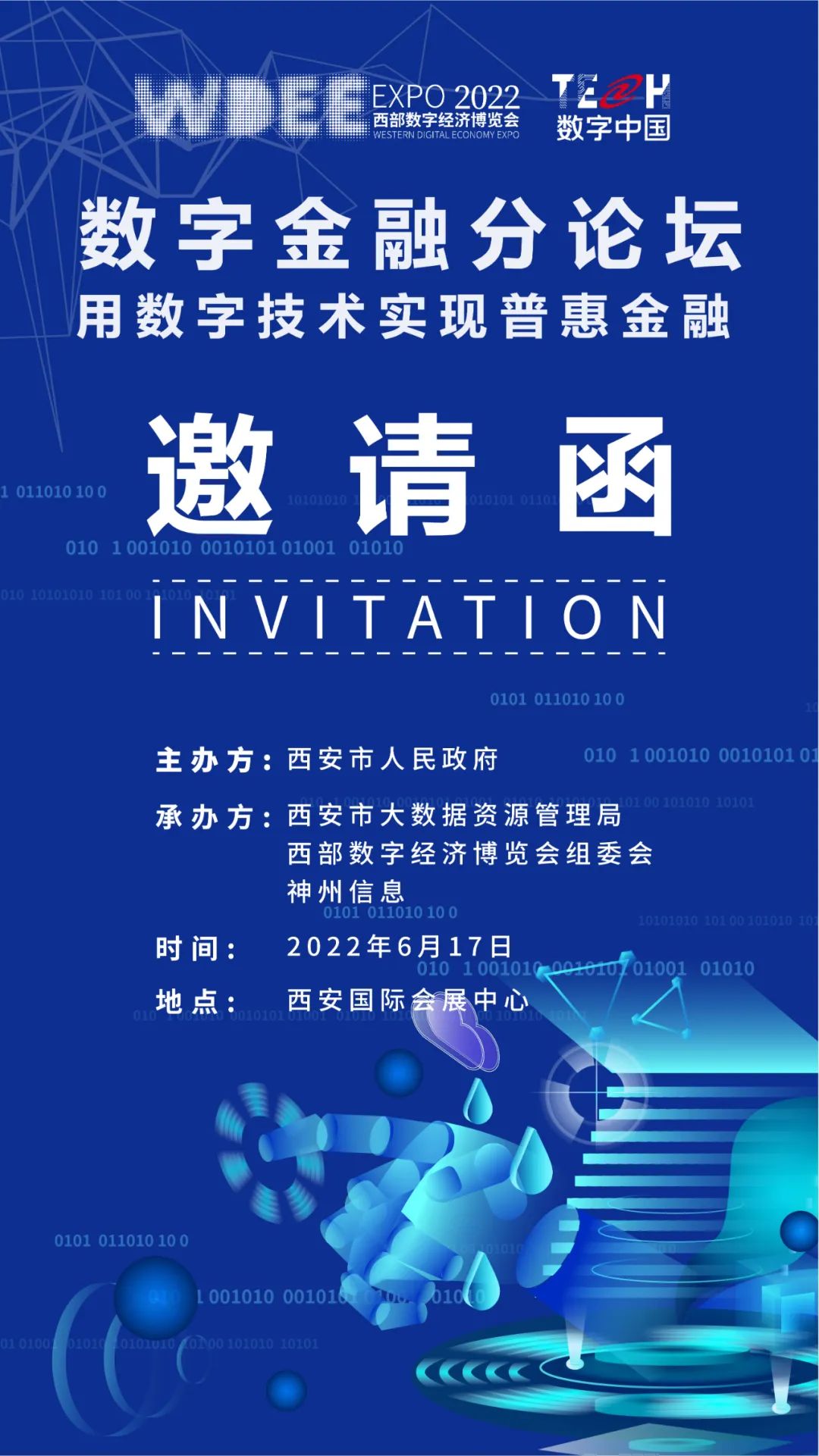 聚焦数字金融,关注金融机构全面数字化转型大趋势,2022西部数博会期间将举办数字金融高峰论坛。同时论坛作为“2022TECH数字中国技术年会”陕西分论坛,以“用数字技术实现普惠金融”为主题,广邀政产学研等生态各界专家、学者同台分享,欢迎各界伙伴关注及参与。