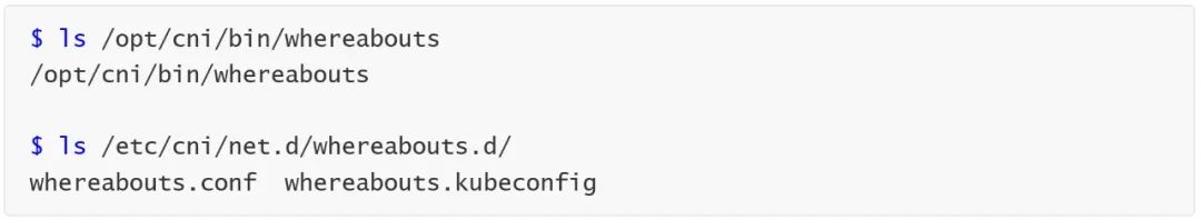 经观察,Pod运行不久后,将会在各节点上的/opt/cni/bin/ 下生成Whereabouts 的可执行文件,/etc/cni/whereabouts.d/下生成网络定义文件以及用于配置集群访问的文件。