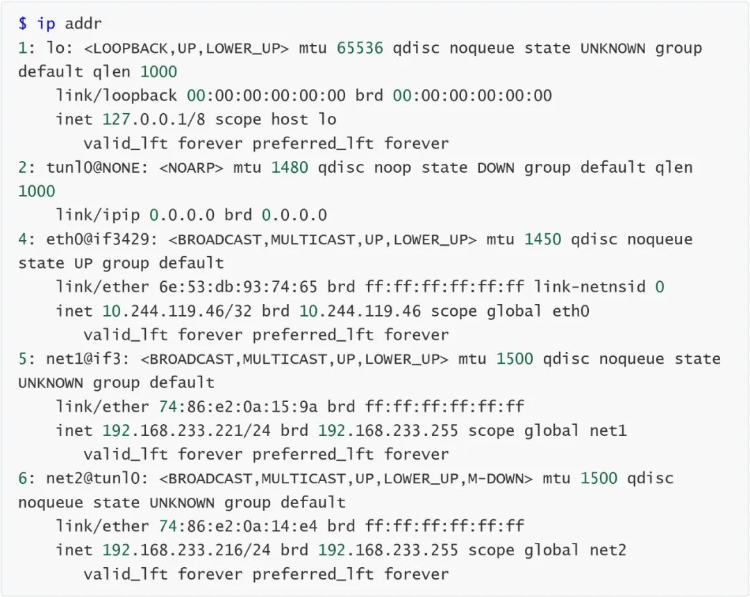 现在网卡已正确创建,IP 地址也按预期划分范围分配。其中10.244.119.46这个地址是由Calico创建和分配的。