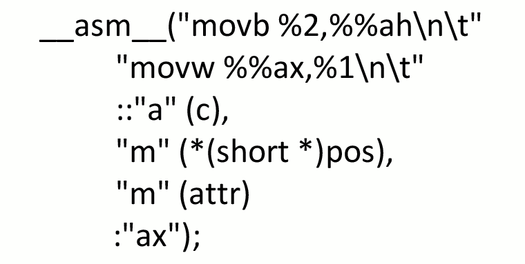 2. 在整理完应该输出的字符串之后,printf就要调用console_print函数了,这个是控制台函数,主要就是在屏幕上输出字符串,包含换行、光标移动和定位等。这里console_print嵌入了一段涉及显示的汇编: