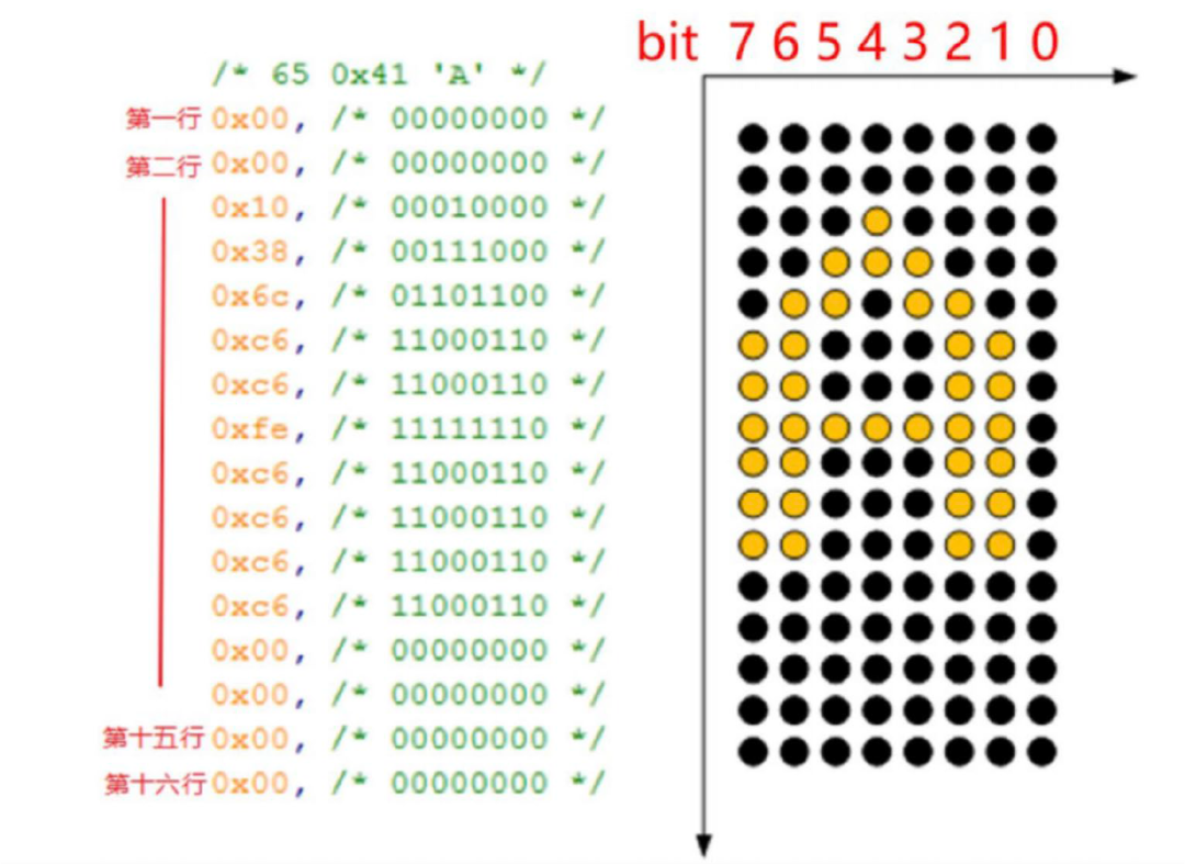 通过这个图,我们可以看到第三行0x10(0b00010000),其实就一一对应着右侧第三行的LCD显示,一共8个点,每个点用1个bit表示(0是熄灭,1是点亮)。这里就是A的最高的那个点。左侧的这组数据,就表示A的16*8格式下的点阵字符。