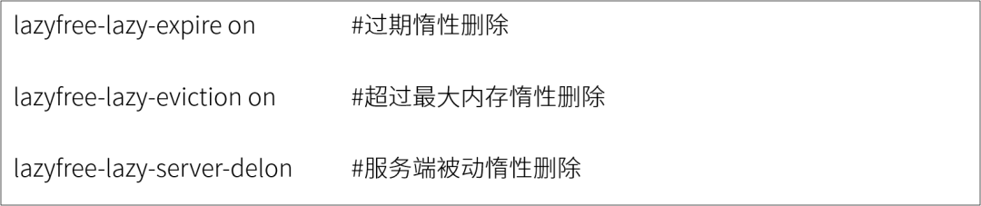 被动删除是指利用Redis自身的key消除策略,配置lazyfree情性删除。但是参数默认是关闭的。可配置如下参数开启: