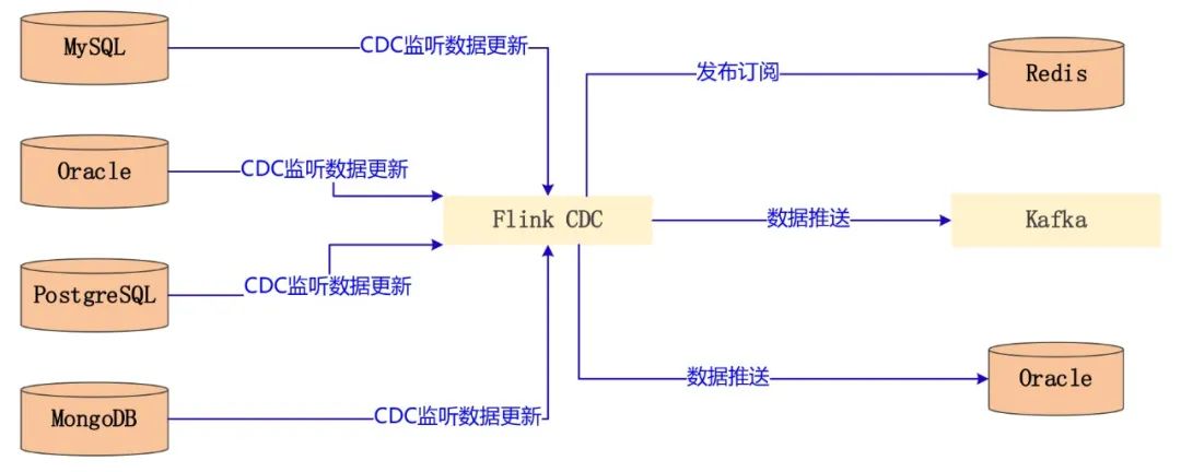 因此,不论从性能还是适用范围上,Flink CDC 都可以作为最佳选择。Flink CDC Connectors是Apache Flink的一组source连接器,使用变更数据捕获 (CDC) 从不同的数据库中获取变更,Flink CDC连接器集成了Debezium作为引擎来捕获数据变化,所以它可以充分发挥Debezium的能力。目前连接器支持的数据库有:MySQL(5.6+)、PostgreSQL(9.6+)、MongoDB(3.6+)、Oracle(11+)、TiDB(5.1.x+)、SQL Server(2012+)和Oceanbase(3.1.x+)。