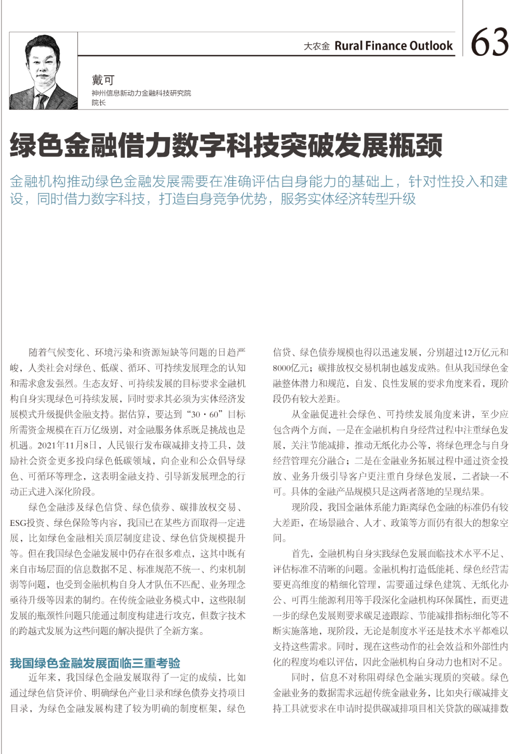 绿色金融涉及绿色信贷、绿色债券、碳排放权交易、 ESG投资、绿色保险等内容,我国已在某些方面取得一定进展,比如绿色金融相关顶层制度建设、绿色信贷规模提升等。但在我国绿色金融发展中仍存在很多难点,这其中既有来自市场层面的信息数据不足、标准规范不统一、约束机制弱等问题,也受到金融机构自身人才队伍不匹配、业务理念亟待升级等因素的制约。在传统金融业务模式中,这些限制发展的瓶颈性问题只能通过制度构建进行攻克,但数字技术的跨越式发展为这些问题的解决提供了全新方案。