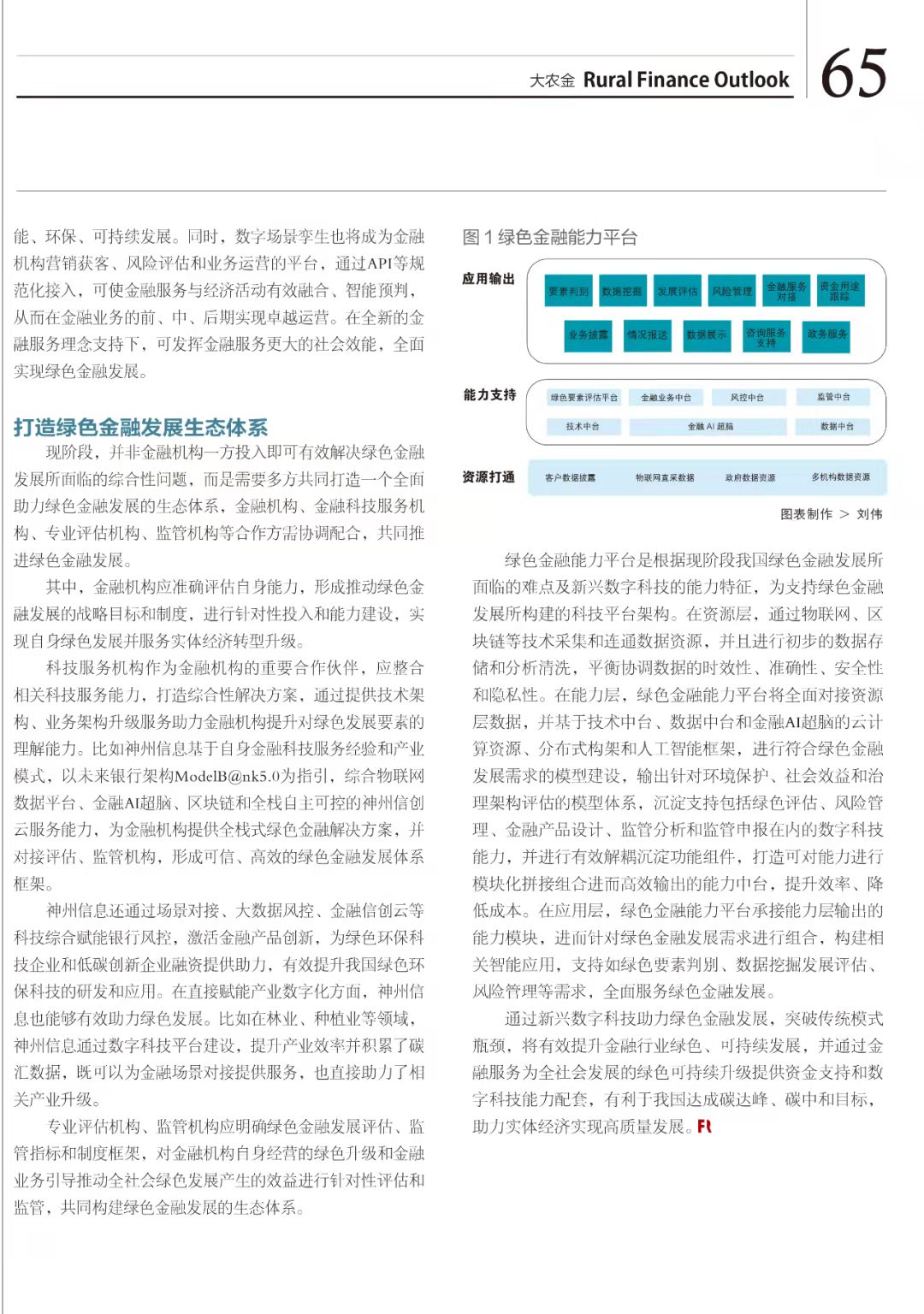 神州信息还通过场景对接、大数据风控、金融信创云等科技综合赋能银行风控,激活金融产品创新,为绿色环保科技企业和低碳创新企业融资提供助力,有效提升我国绿色环保科技的研发和应用。在直接赋能产业数字化方面,神州信息也能够有效助力绿色发展。比如在林业、种植业等领域,神州信息通过数字科技平台建设,提升产业效率并积累了碳汇数据,既可以为金融场景对接提供服务,也直接助力了相关产业升级。