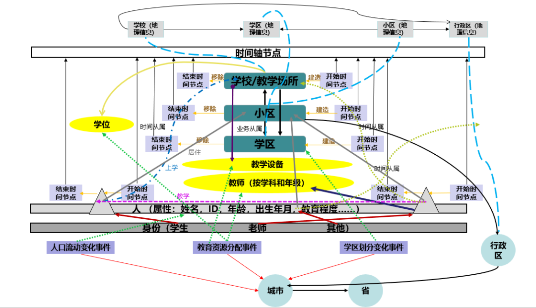 利用城市知识图谱产品,通过对城市空间(市、县、小区、学区)、城市物(学校、教学设备、道路)、城市自然人(教师、学生)、城市事件(入学事件)、城市时间(入学时间、归属时段)等知识的定义,可以构建城市教育领域基础知识模型,并对接CIM平台,基于CIM数据的建立城市实体,实现实体数据和知识模型的映射关系,按照图模型将数据储存,建立城市教育知识图谱。