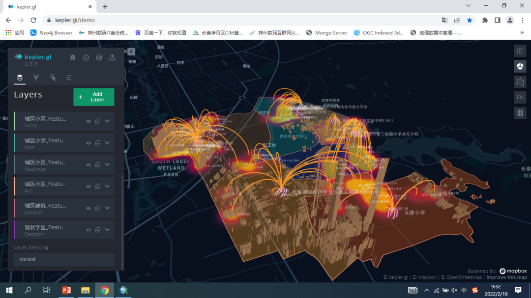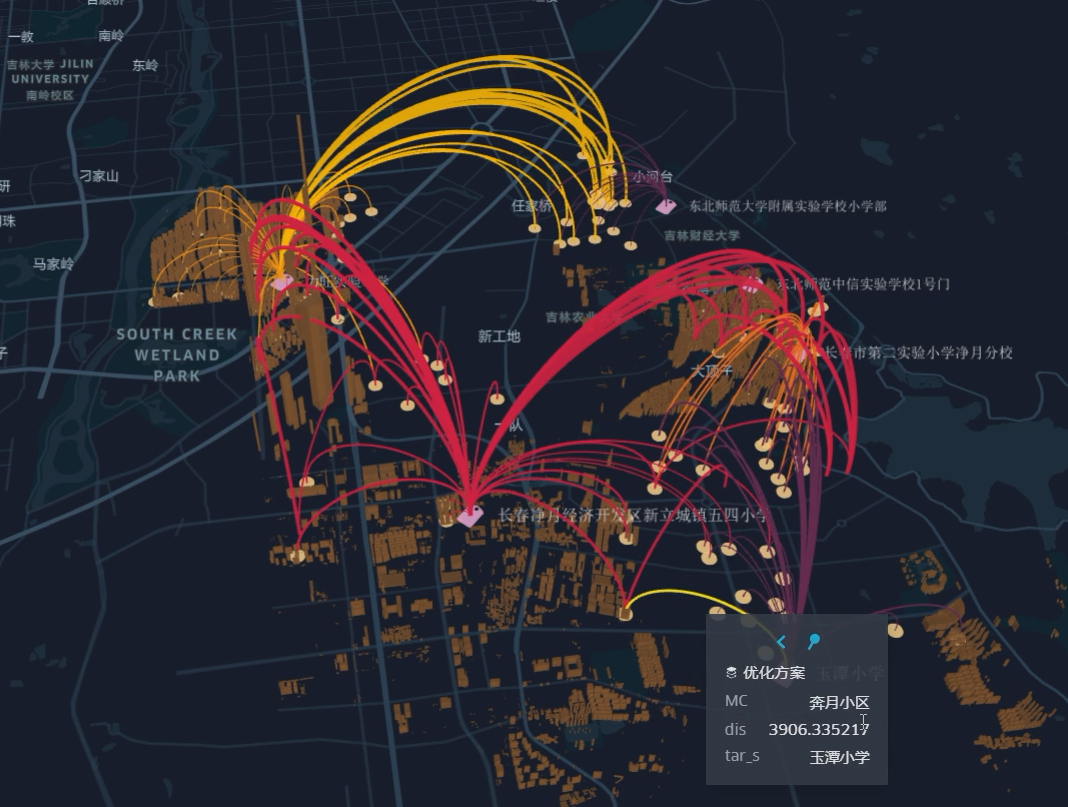 图谱建设完毕后,在可视化方面,可以通过产品可视化工具,实现城市图谱信息基于地图的可视化展示,如图为某年某地社区、学校的对应关系,底图透明度多边形表示各小学学区分布;连线起点表示各个小区,终点为目标小学;起点热力图表示各小区入学学生分布。