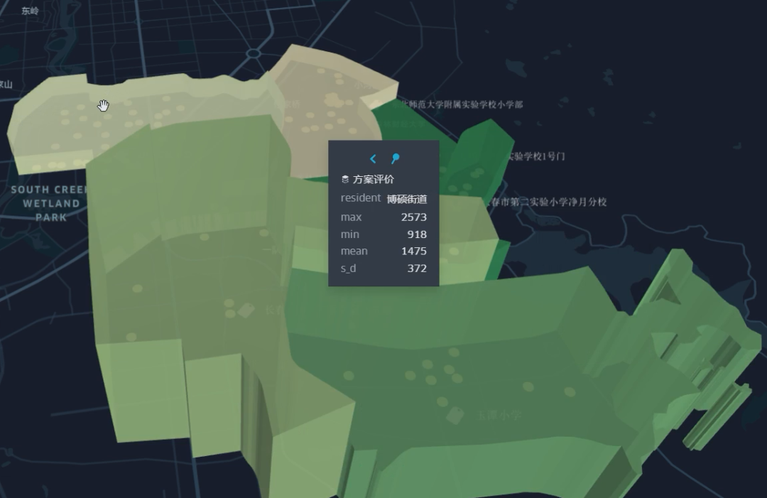 在智能分析方面,在可以借助空间分析API,判断各校指定入学半径内的小区;结合城市道路交通网络,利用图分析API(最短路径)进行学生最短入学距离计算,评价单个小区学生入学情况。在全区新生入学设计时,考虑区域内单校和多校入学,利用优化算法API,寻找满足入学规则前提下的最优入学分配方案(总入学距离最短),作为学区分配的参考依据。此外,还可以利用统计分析工具,计算各校平均师资、教师学科分布、设备分布,指导教育资源的优化配置。