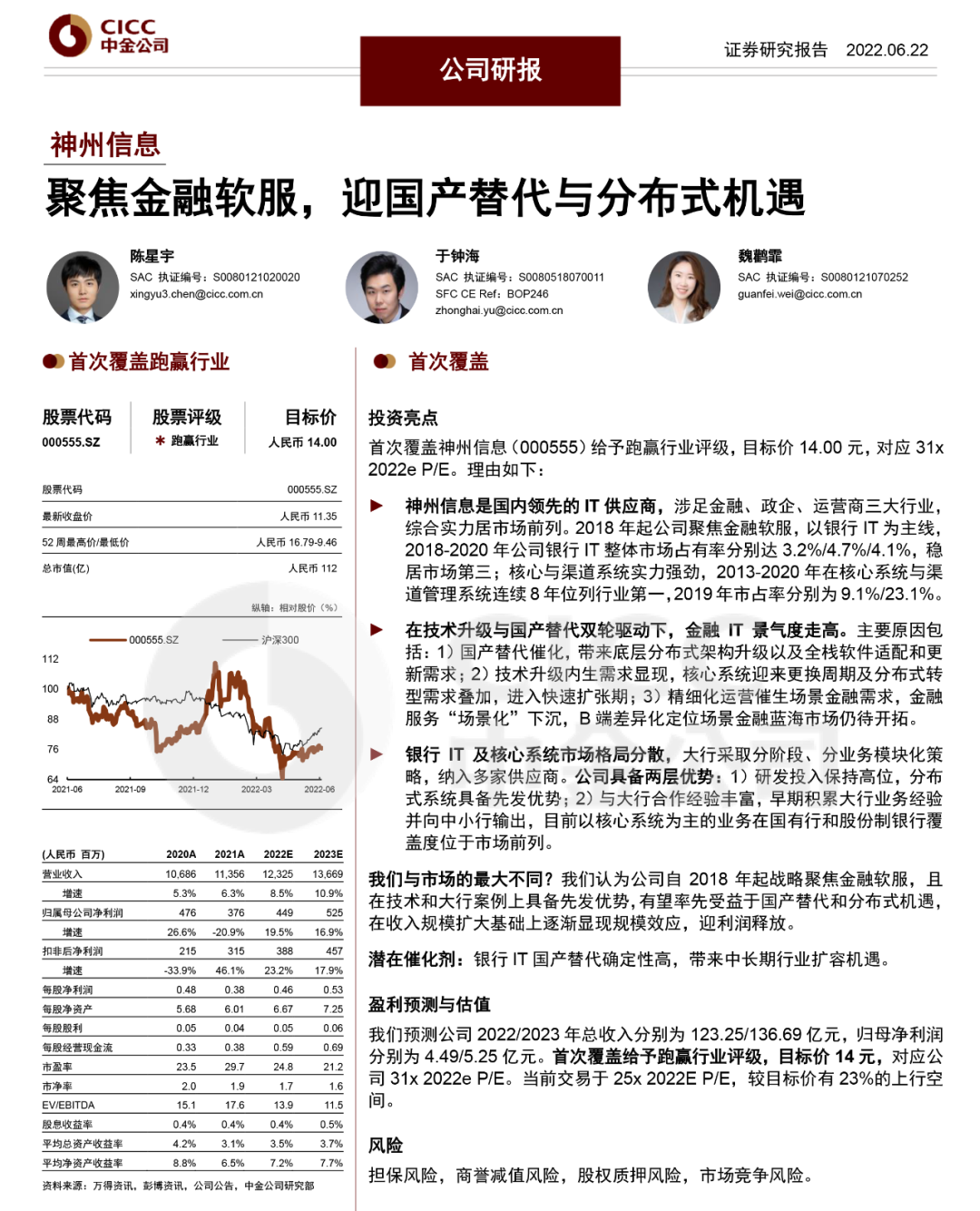 神州信息自2018年起战略聚焦金融软服,且在技术和大行案例上具备先发优势,有望率先受益于国产替代和分布式机遇,在收入规模扩大基础上逐渐显现规模效应,迎利润释放。潜在催化剂:银行IT国产替代确定性高,带来中长期行业扩容机遇。