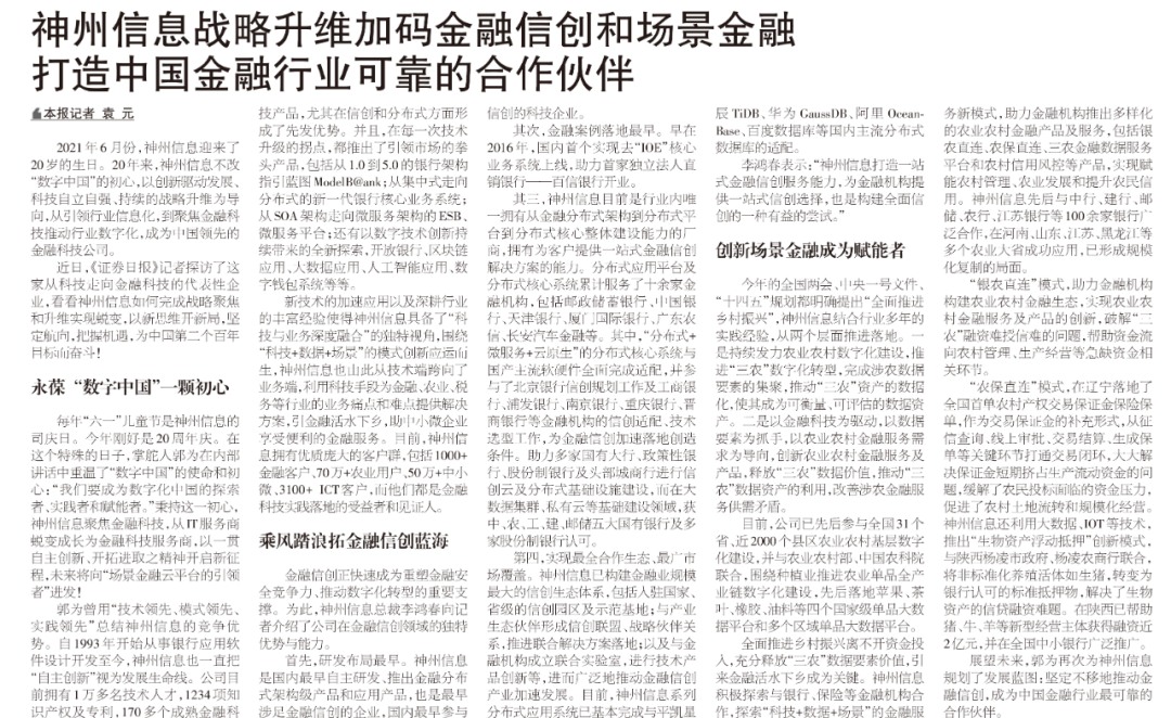 2021年6月份,神州信息迎来了20岁的生日。20年来,神州信息不改“数字中国”的初心,以创新驱动发展、科技自立自强、持续的战略升维为导向,从引领行业信息化,到聚焦金融科技推动行业数字化,成为中国领先的金融科技公司。