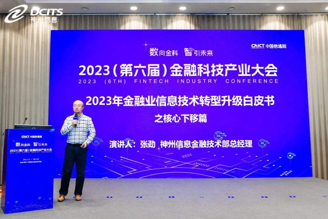 在本次大会上, 神州信息联合中国信通院、阿里云、腾讯云、华为、金篆信科等单位共同发布了《砥砺深耕,华章日新—2023年金融业信息技术转型升级白皮书之核心下移篇》(以下简称“白皮书”),神州信息副总裁马洪杰(上图右三)、中国信通院副总工程师石友康(上图左三)、阿里云新金融事业部副总经理 宋勇(上图右二)、腾讯金融云副总经理王丰辉(上图左二)、华为数字金融军团分布式新核心业务总经理韩满(上图右一)、金篆信科副总经理张校逸(上图左一)等嘉宾共同出席发布仪式,神州信息金融技术部总经理张劲(下图)作为代表对白皮书进行了解读。